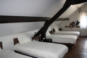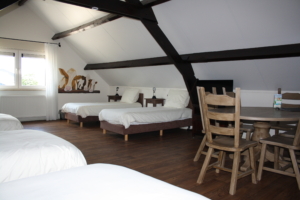 Das große Zimmer, auch das Familienzimmer genannt, befindet sich im ersten Stock. In diesem Zimmer spüren Sie gleich die gemütliche Atmosphäre mit fröhlichen, hellen Farben. Sechs Personen können hier die herrlichen Boxsprings geniessen. Sind Sie mit noch mehr Personen, dann gibt es auch noch Platz für eine Luftmatraze. Gemütlich zusammen: mit Freunden oder Verwandten; vielleicht für ein Wochenende. Die eigene Dusche und das WC befinden sich direkt nebenan im Korridor. Natürlich gibt es auch eine Sitzecke mit Fernseher. Von diesem Zimmer haben Sie eine schöne Aussicht auf die Aktivitäten des Bauerhofes.